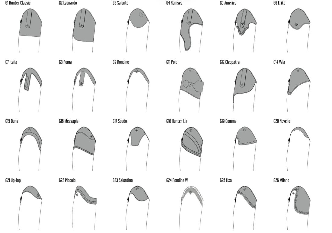 Below are a large number of different tops shown. These images show the different shapes and designs that are possible for the top of the boot. So it is only about the shape of the top. These tops are available in different leather types and colors, and with different decorations.