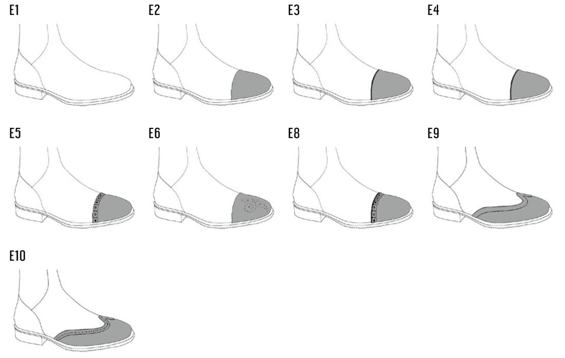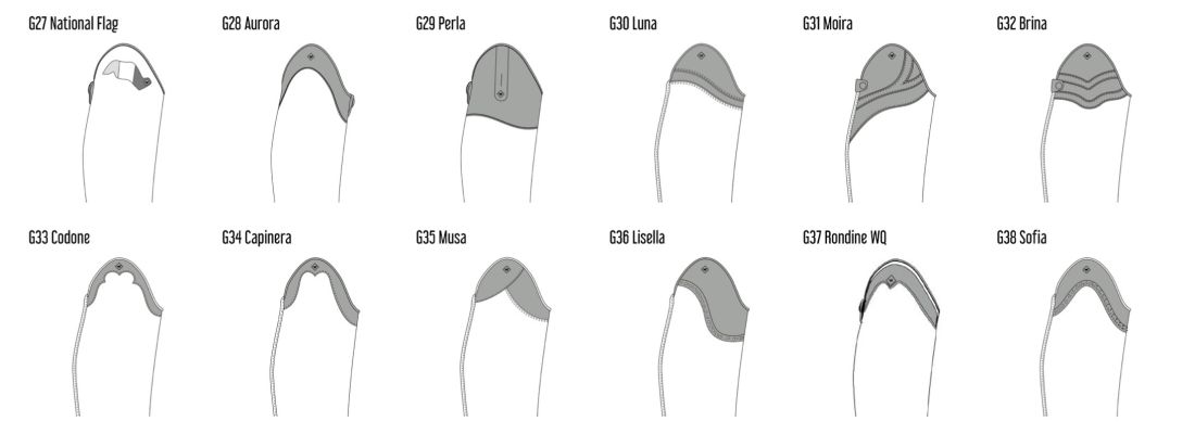 Various options for the toe cap are shown below. The color of the leather, the piping or the details can be adjusted. When choosing the toe cap, it is therefore only about the shape.