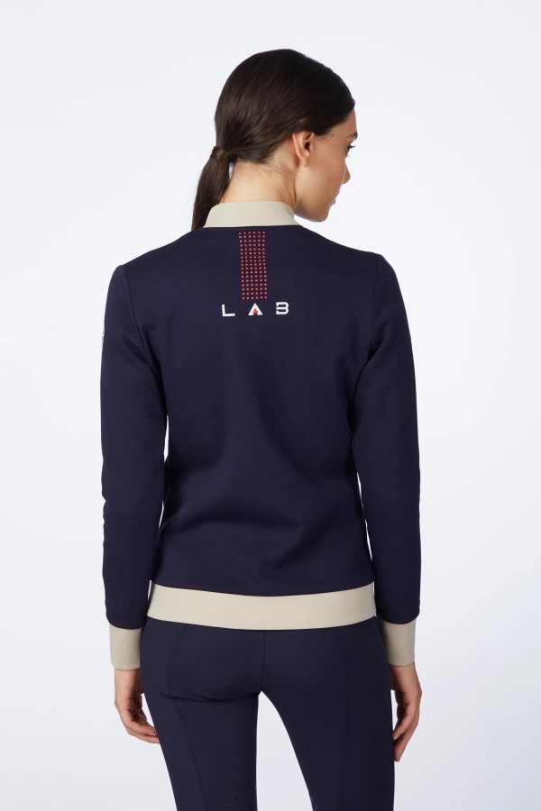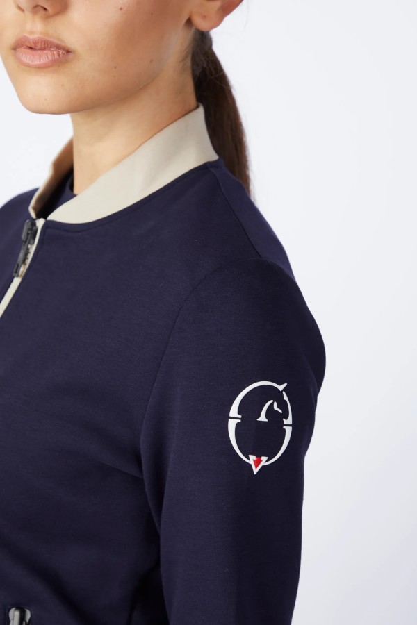 Vestrum LAB navy cardigan for women in soft technical fabric with two-way zipper and zip pockets. Beige hem and cuffs add a sporty refined touch. Perfectly pairs with the Shedir bodywarmer. Ideal for training, stable wear and competitions.