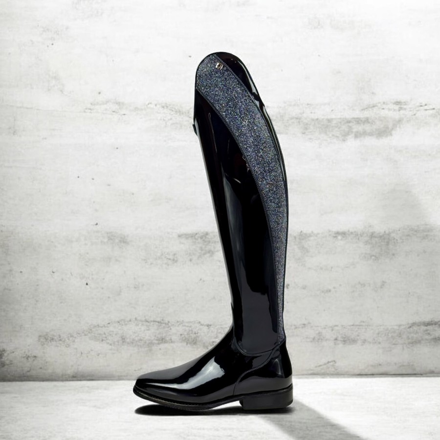 Riding boots in best selling model Bellini, by the Italian brand DeNiro. The bellini is known for its fine ankle. These boots are in patent blu navy and have the Gali top running throughout the boot in Rocks blue