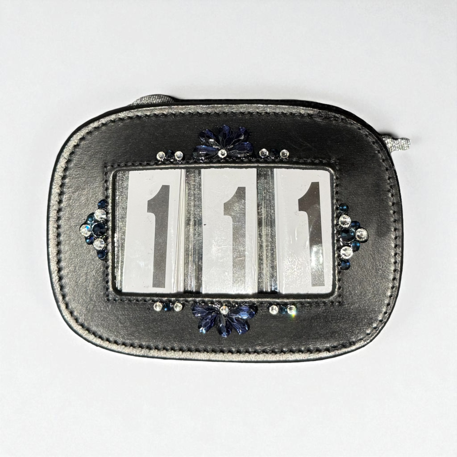 Plastronique custom number holder black leather dark blue and crystal | RUITERSPORT DEHERTOGHE Lydia