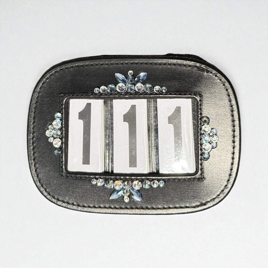 Plastronique custom number holder black leather, light blue and crystal | RUITERSPORT DEHERTOGHE Lydia