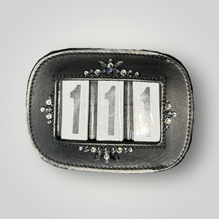Plastronique custom number holder black leather, navy and crystal | RUITERSPORT DEHERTOGHE Lydia