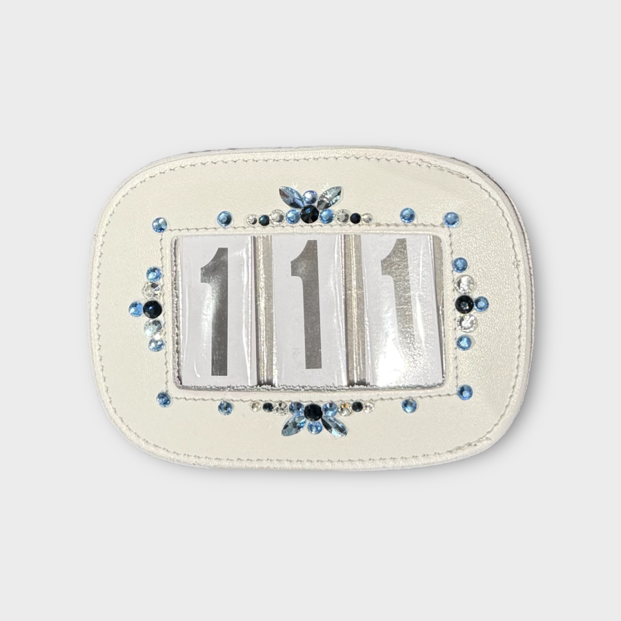 Plastronique custom number holder white leather, light blue and crystal | RUITERSPORT DEHERTOGHE Lydia