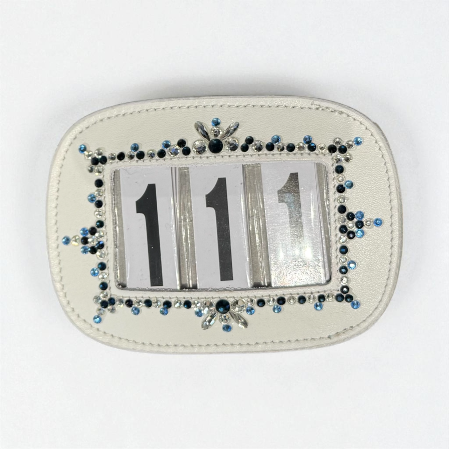 Plastronique custom number holder white leather, navy / light blue / crystal | RUITERSPORT DEHERTOGHE Lydia