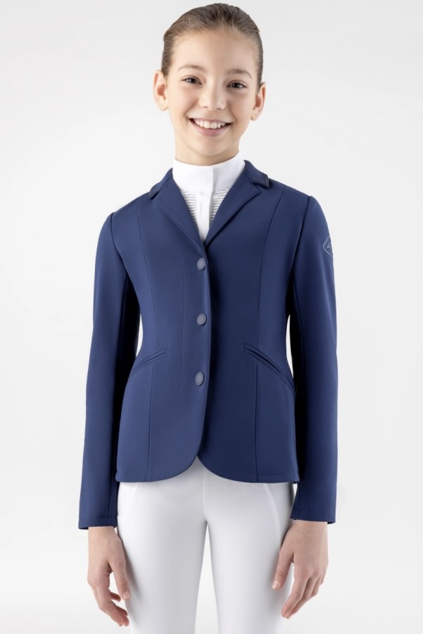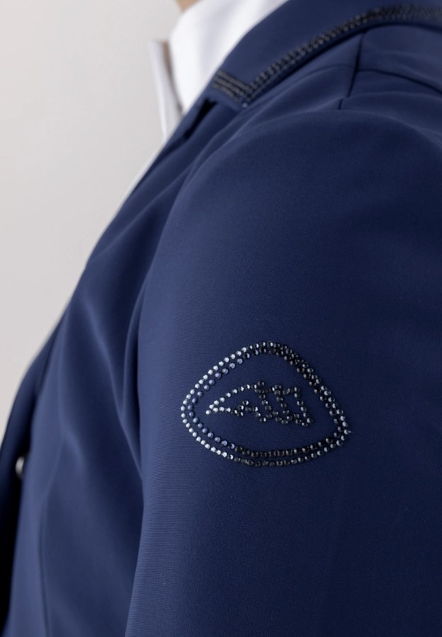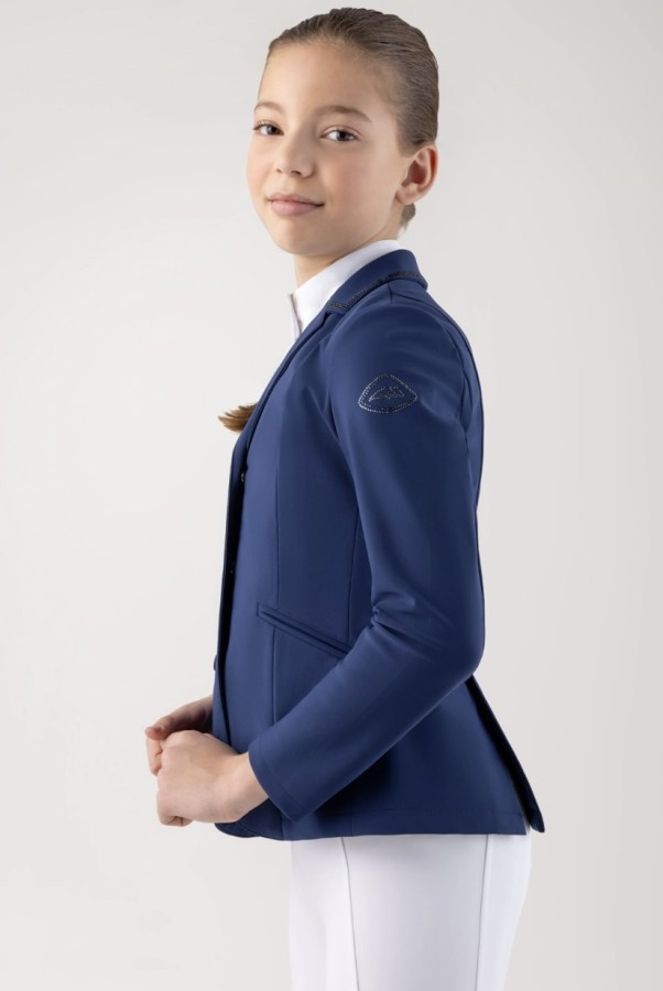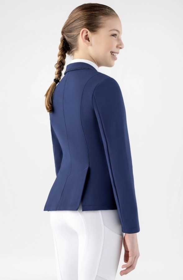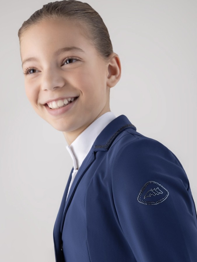For young riders who want to stand out, this girls’ competition jacket combines comfort, elegance, and functionality. Lightweight and breathable, it allows freedom of movement even on the busiest days. The sleek, refined design is enhanced by tone-on-tone rhinestones on the collar, pockets, and shoulder, adding a subtle sparkle. A practical yet sophisticated piece, perfect for those seeking style and performance in one garment.